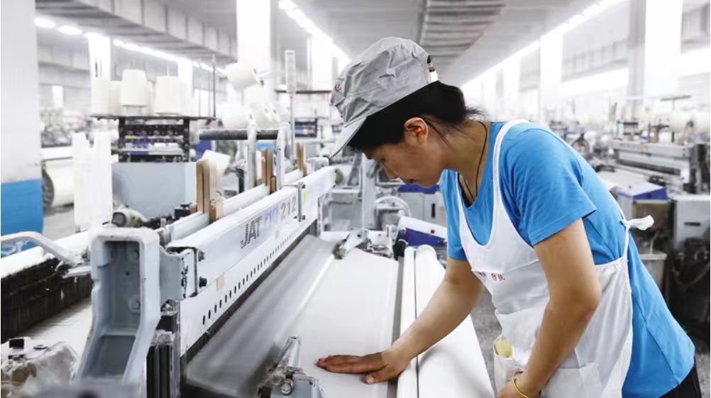 图为牛相双在认真检查布面质量,确保每码布都是精品
