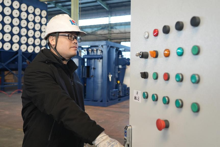 图为周广振在车间查看出口到印尼的吸砂机、除尘设备调试情况